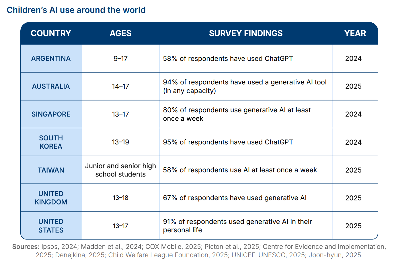 The first key takeaway: student use of AI is ubiquitous and worldwide. The vast majority of children surveyed in many countries have used AI. In the United States, more than 91% of children age 13-17 have used generative AI in their personal life, according to a survey from May 2025. Other studies have shown similar depth of usage.