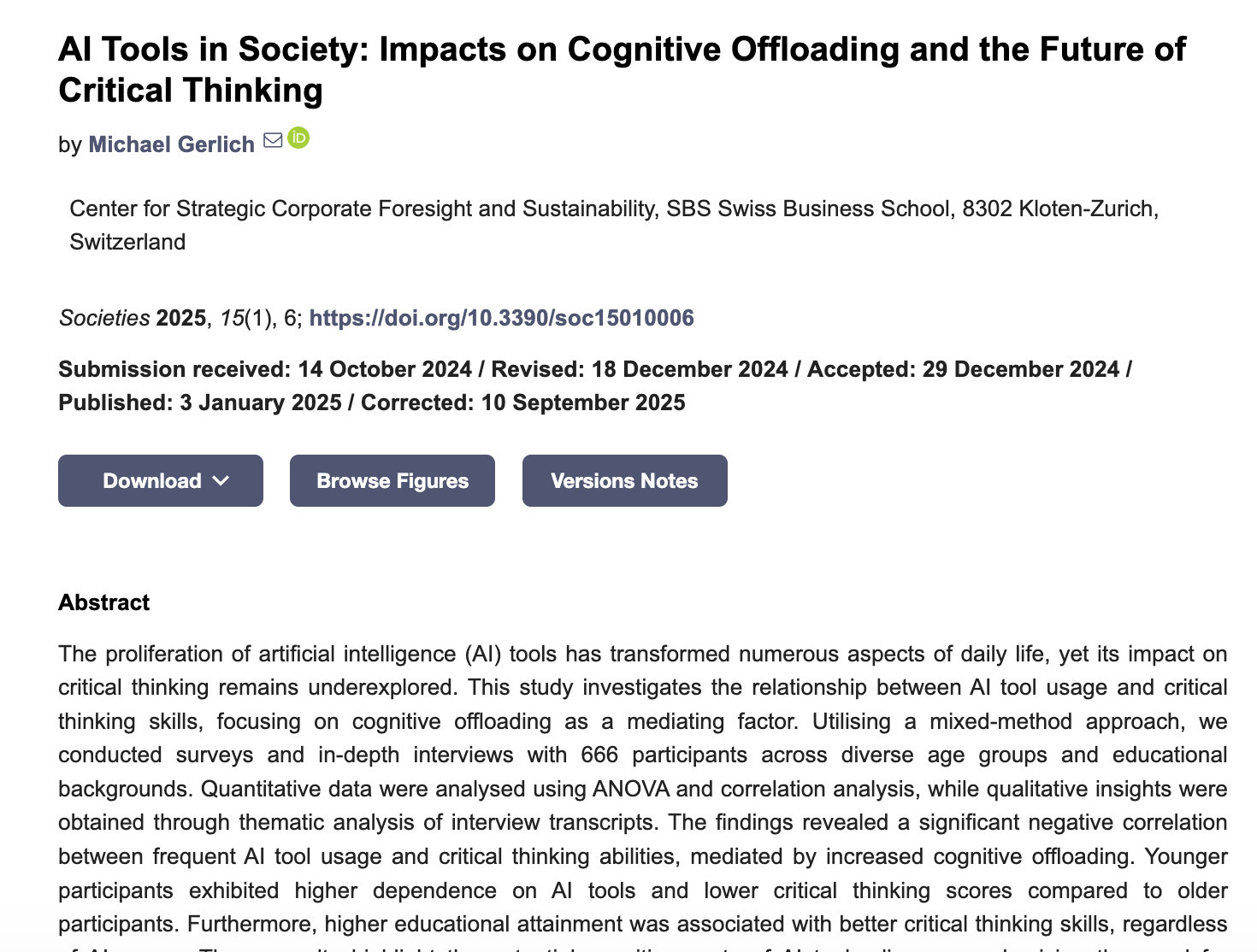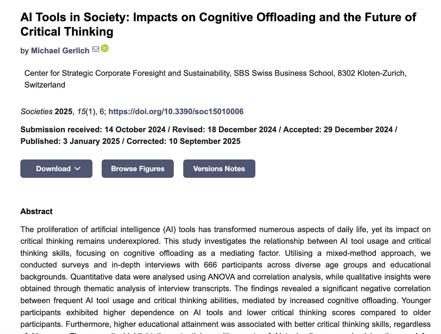 Critical thinking is particularly at risk. One paper in particular was published last year by Michael Gerlich in Switzerland. It shows just how dangerous the lure of AI can be to our critical thinking skills.